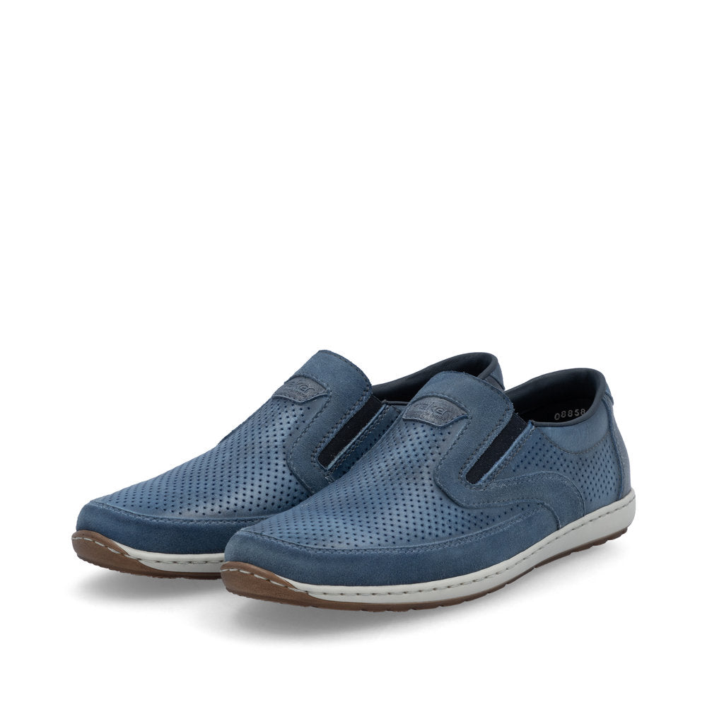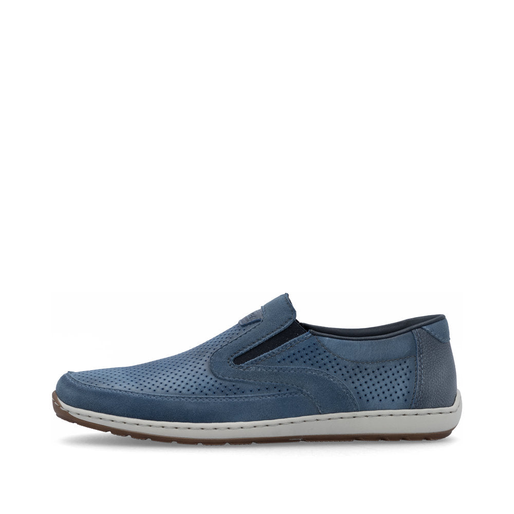 These casual blue Rieker slippers made of smooth leather are simple and practical. The traditional stitchdown construction makes the shoe particularly flexible and robust and ensures a great fit. The elastic band makes it especially easy to put on and take off the shoe. The shock-absorbing and light sole ensures a pleasant wearing sensation. The cover sole is also extra soft. The comfort width G 1/2 offers enough space for the feet to feel comfortable even when worn for longer periods. Just slip into it and feel good!