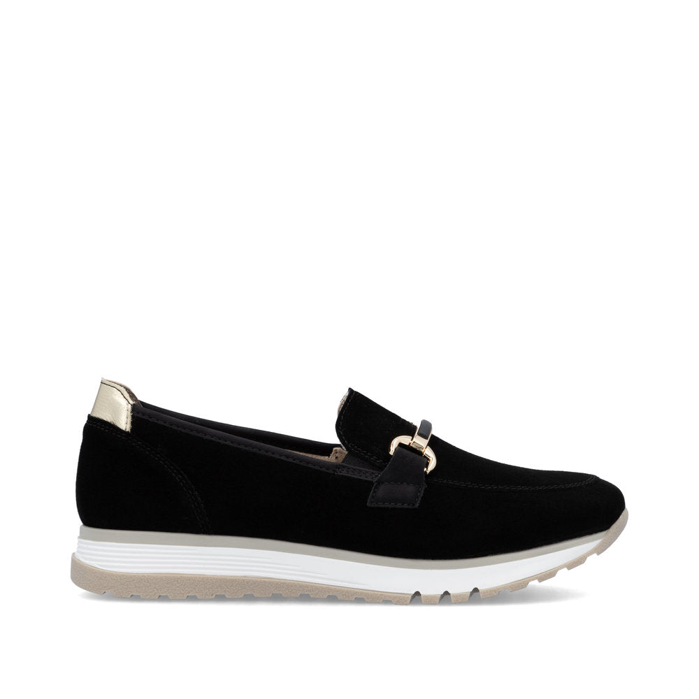 • You won't want to take off these black Rieker loafers made of suede leather. The elastic band makes it easy to put on and take off the shoe. The shoe has a grippy sole that impresses with good traction for a secure step. The padded and removable insole offers comfort and functionality for every day. A feel-good factor on top is the extra width H, which offers more space in the shoe.