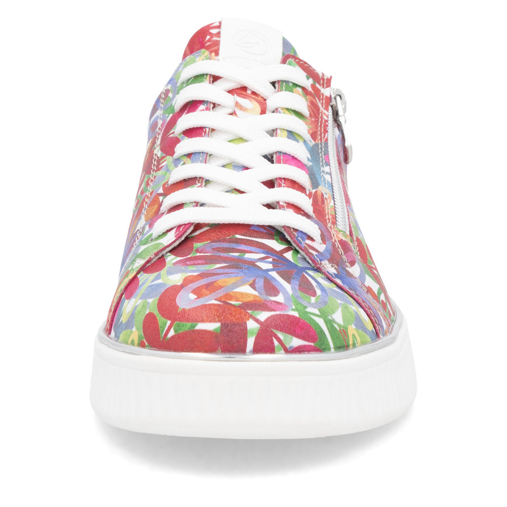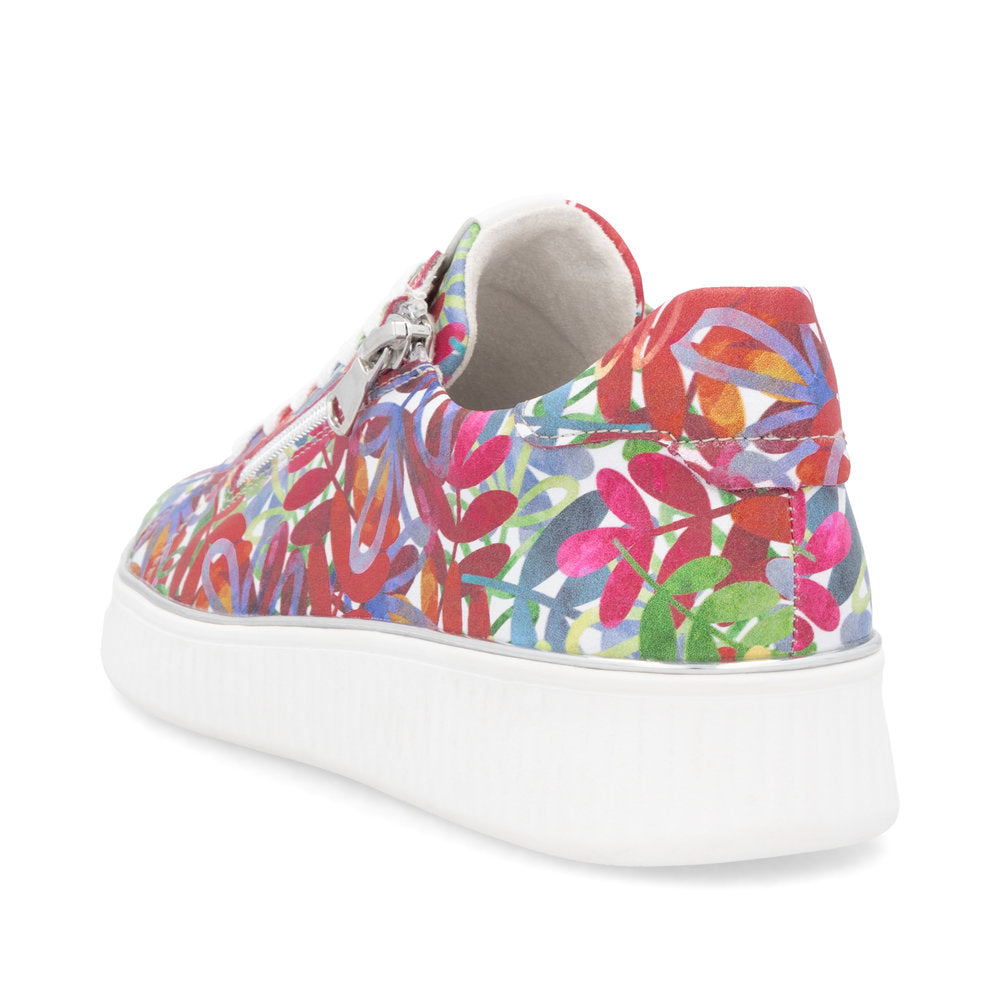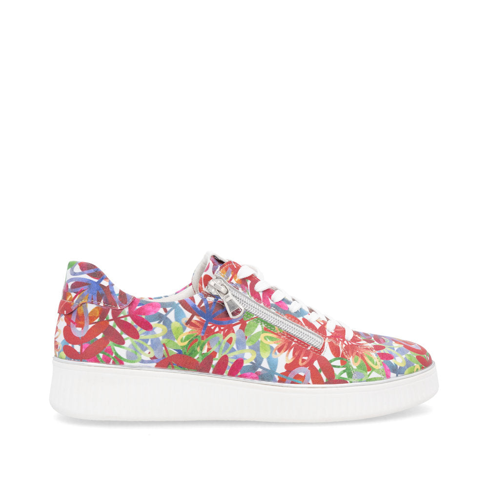 These comfortable multi-coloured Remonte low-top sneakers made of smooth leather impress with a cool look and functional power. The lacing complements the zipper and thus guarantees optimal support and perfect fit. The Lite 'n Soft technology combines a super light sole with a padded and removable insole. The sneakers in comfort width and are equipped with a light microvelour lining.