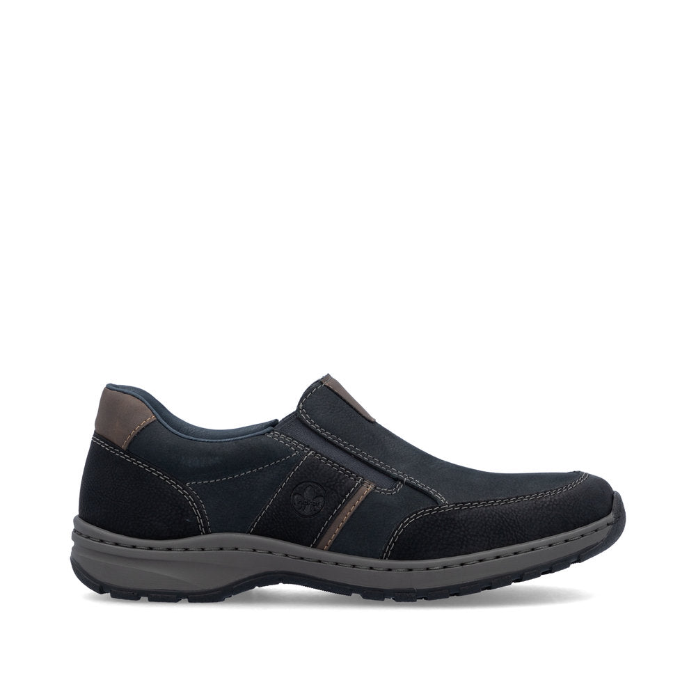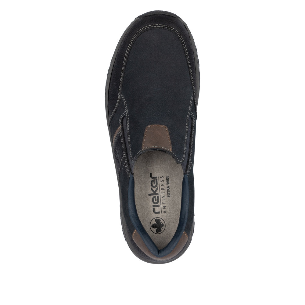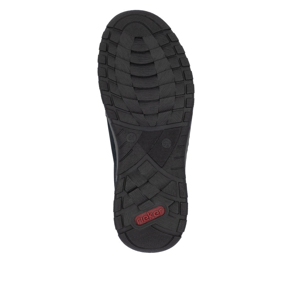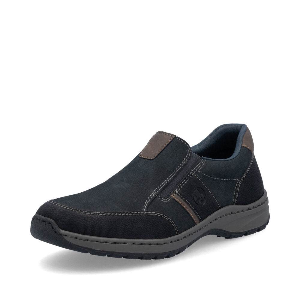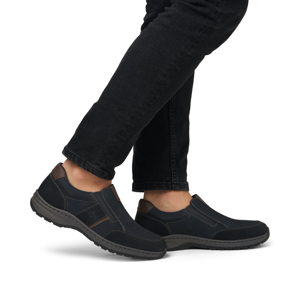 • Be cool and casual on the move with these blue Rieker slip ons made of smooth leather. Made with the stitchdown construction, the model is robust, flexible and offers a perfect fit. The elastic band makes it easy to put on and take off the shoe. The sole is both shock-absorbing and light, offering a double sense of well-being at every step. The slippers also score with a removable insole. Thanks to the extra width H, there is enough space in the forefoot area.