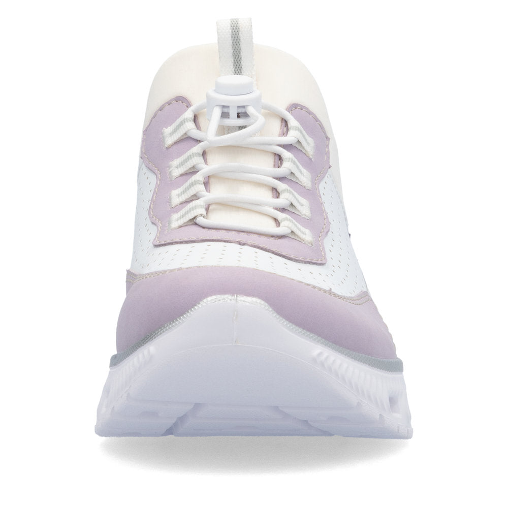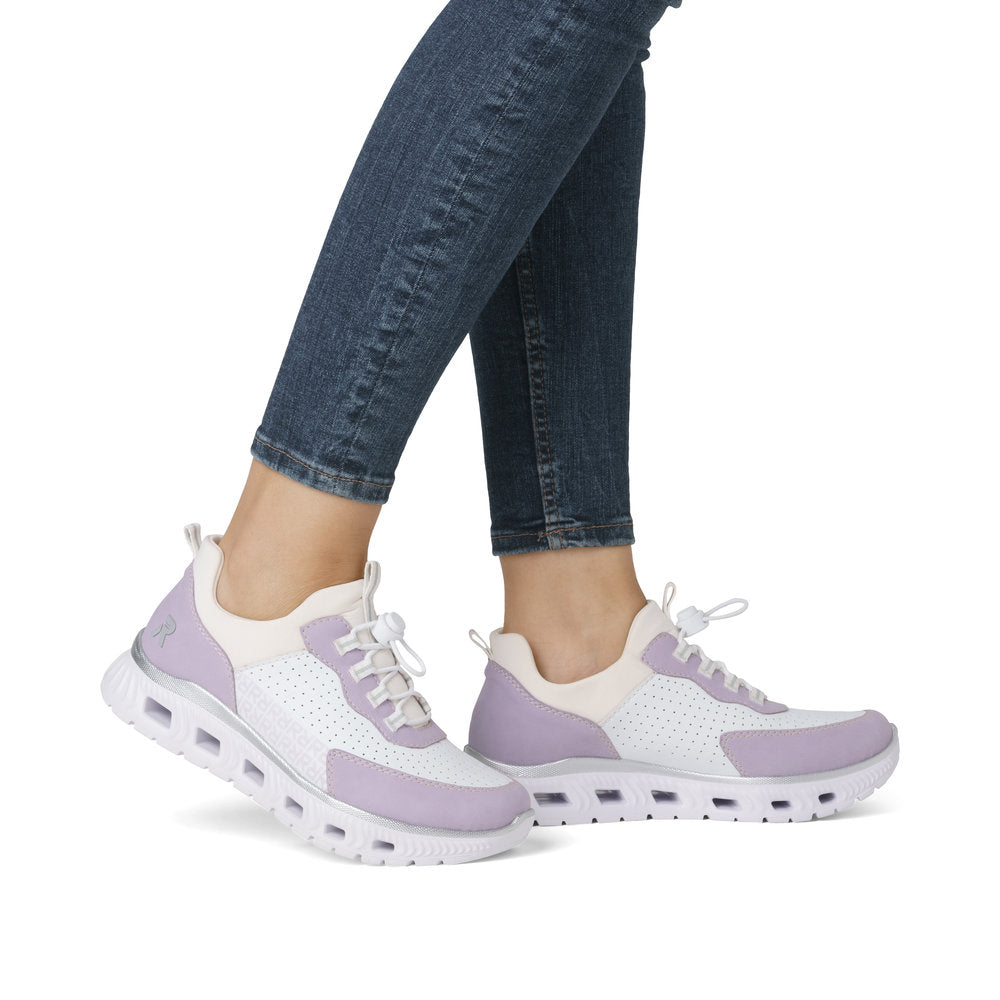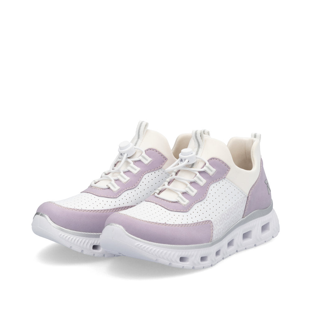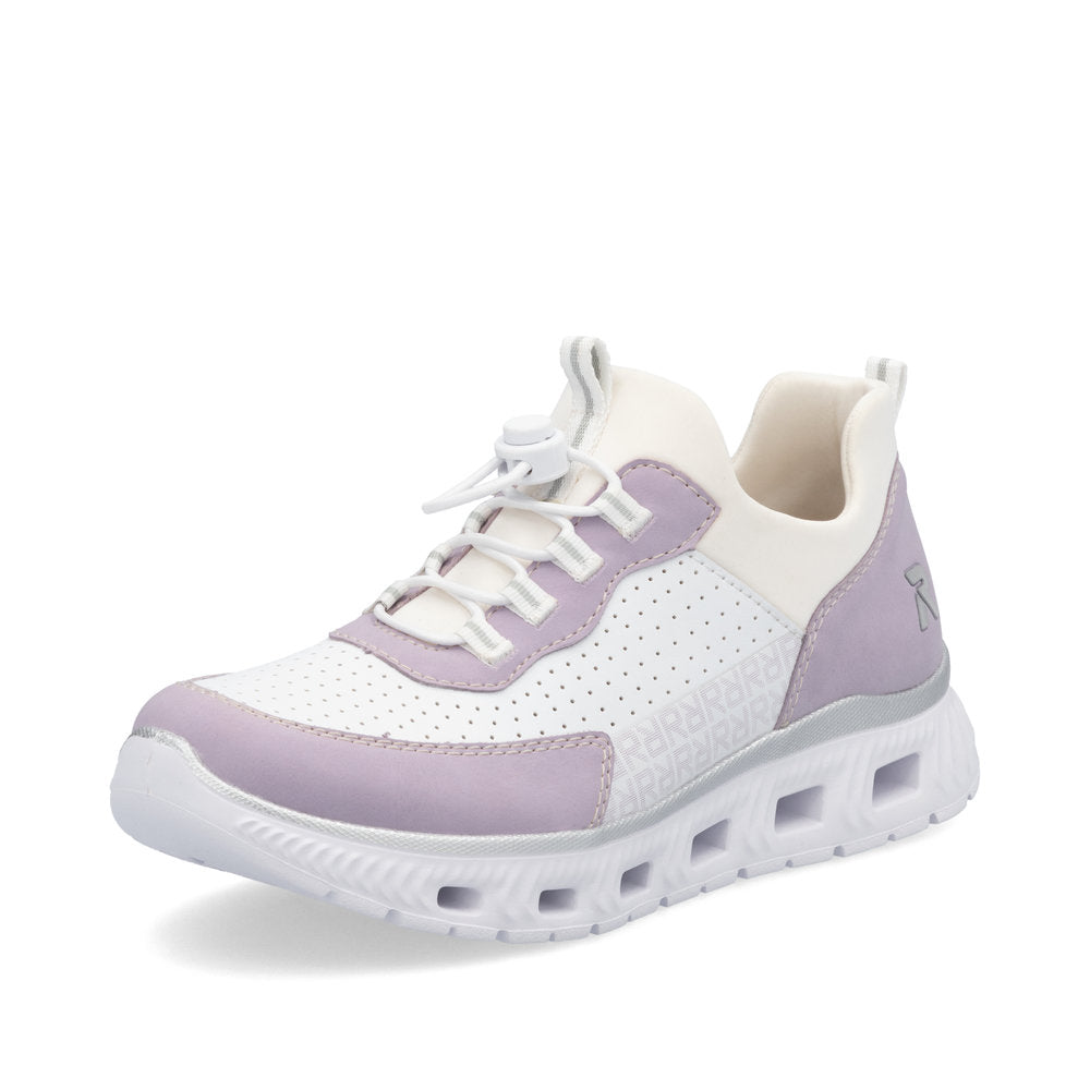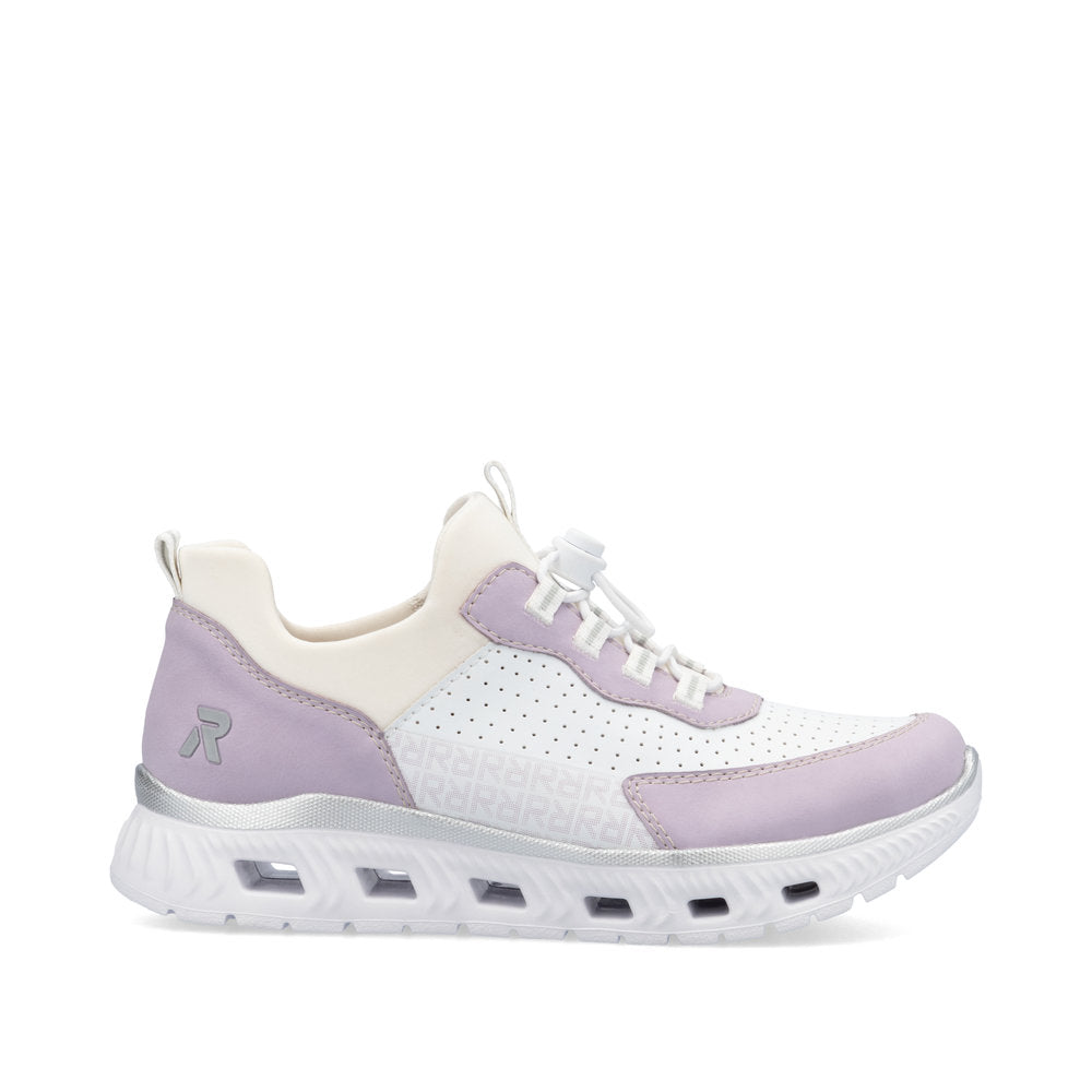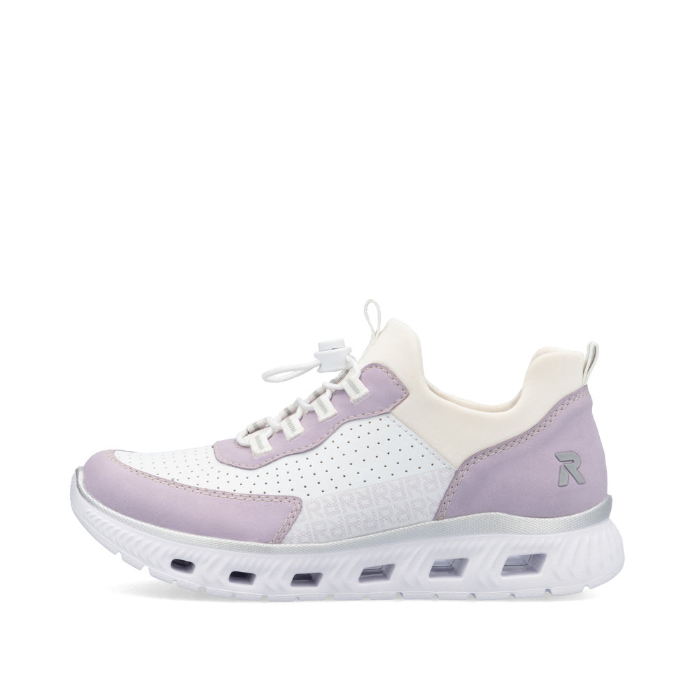 M6067-30 - Rieker low-top sneakers in white-purple made from quality synthetic leather. Vegan materials and animal-free production process. Elastic band plus elastic shaft collar - for an easy on and off. The ultra light and flexible EVA outsole allows maximum speed and agility. The MemoSoft cover sole adapts to the individual foot by moulding the shape in soft foam. Perfect fit thanks to the comfort width.