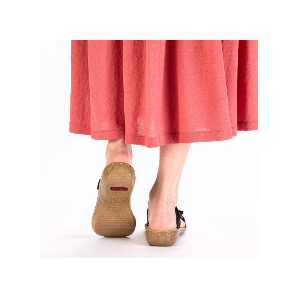 These Rieker mules in black are guaranteed to get you into vacation mood. The stitchdown construction makes the shoe robust and the sole particularly flexible without causing damage at the transition to the upper. A double hook and loop fastener allows for a quick and easy entry. The shock-absorbing and light sole with wedge heel ensures a pleasant, cushioned feeling at every step. The narrow E 1/2 fit gives the foot extra support.