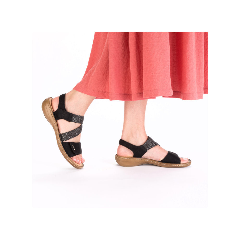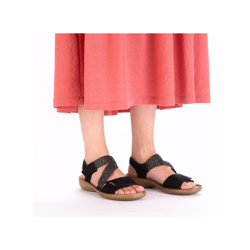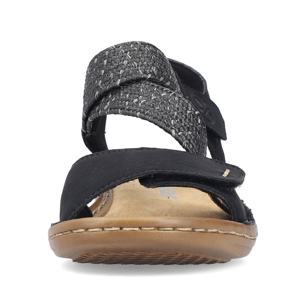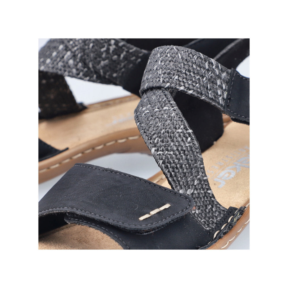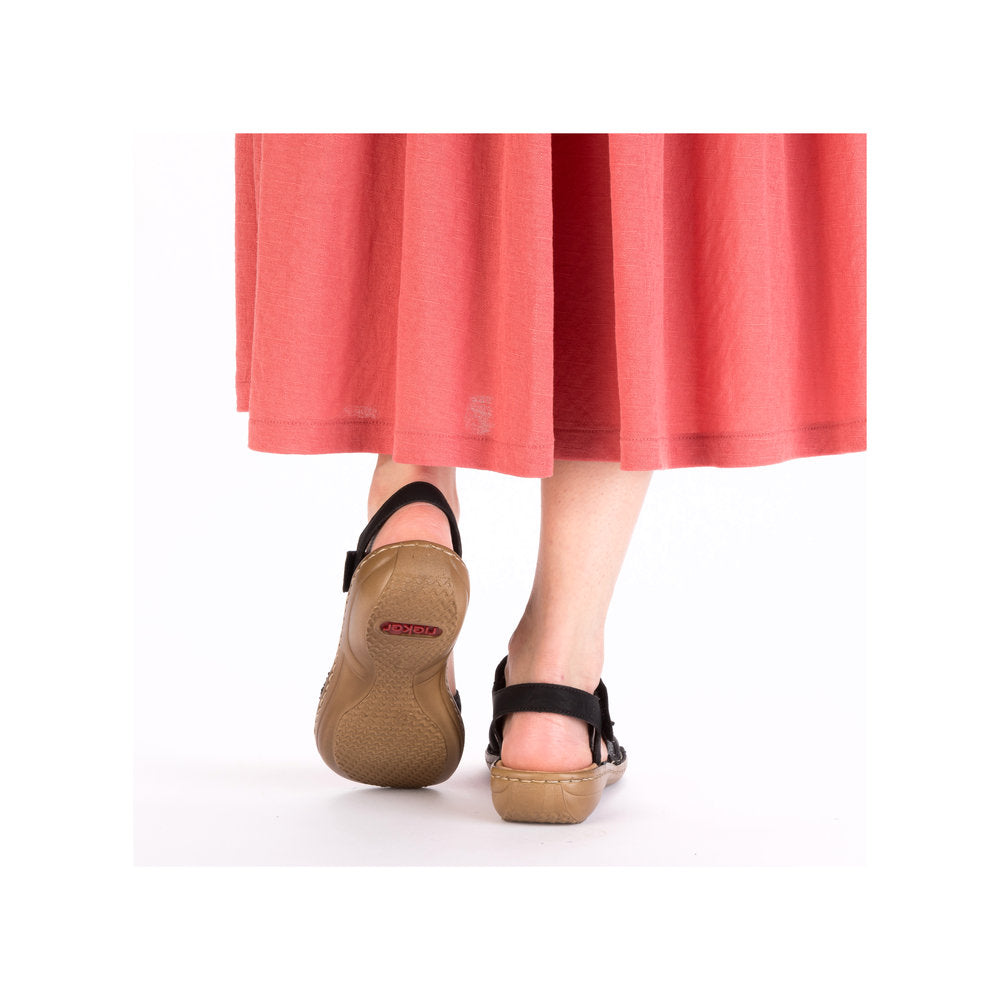 These black Rieker strap sandals impress with their modern design and high comfort. The shoe is constructed in the stitchdown style, which makes it particularly robust and flexible. The sandals are put on in no time thanks to a triple hook and loop fastener. The light and shock-absorbing sole with wedge heel ensures a pleasant walking experience even when worn for long periods. Extra support is provided by the slim fit E 1/2.